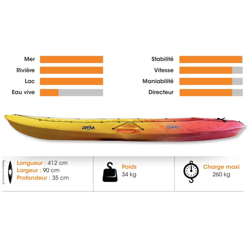 Grand kayak sit-on-top pour 2 adultes et 2 enfants, idéal en mer et rivière le Quatro de RTM est disponible à petit prix pour la pêche ou rando famille! Le grand kayak joueur et ultra stable pour tous.